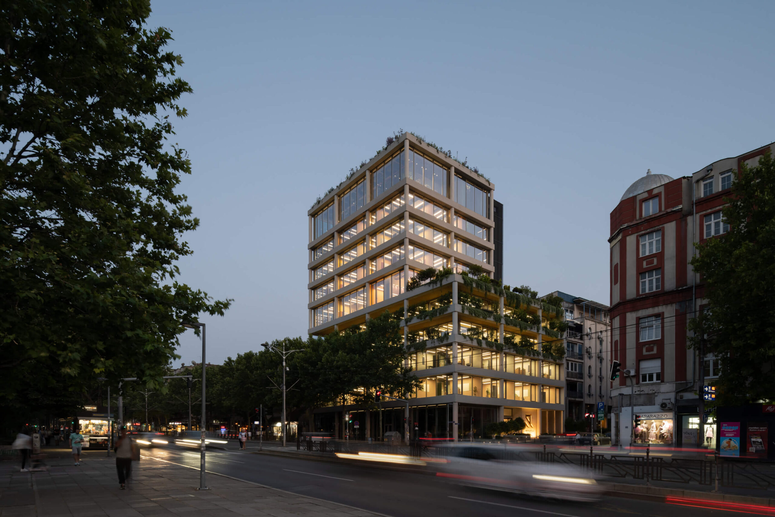 Inspirisani parkom, interpretaciju pročišćenog jezika modernističke arhitekture smo dopunili kontinualnim terasama, sa raskošno dimenzinisanim žardinjerama, kako bi podržale rast bujnog zelenila na fasadi. Tako je postignuto prenošenje atmosfere parka u enterijer, što je dodatni kvalitet u doživljaju objekta – iznutra i spolja, ali i u građenju ulične atmosfere.